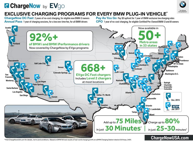 La rete EVgo conta 668 stazioni di ricarica rapida in c.c. a due prese, accessibile a tutti coloro che guidano un veicolo elettrico negli Stati Uniti. L’ampliamento, che punta a supportare i clienti dei modelli Nissan Leaf e BMW i3 e a incentivare l’adozione dei veicoli elettrici, fa seguito alle 120 stazioni di ricarica rapida in c.c. dual-port già annunciate da Nissan e BMW nel dicembre 2015.